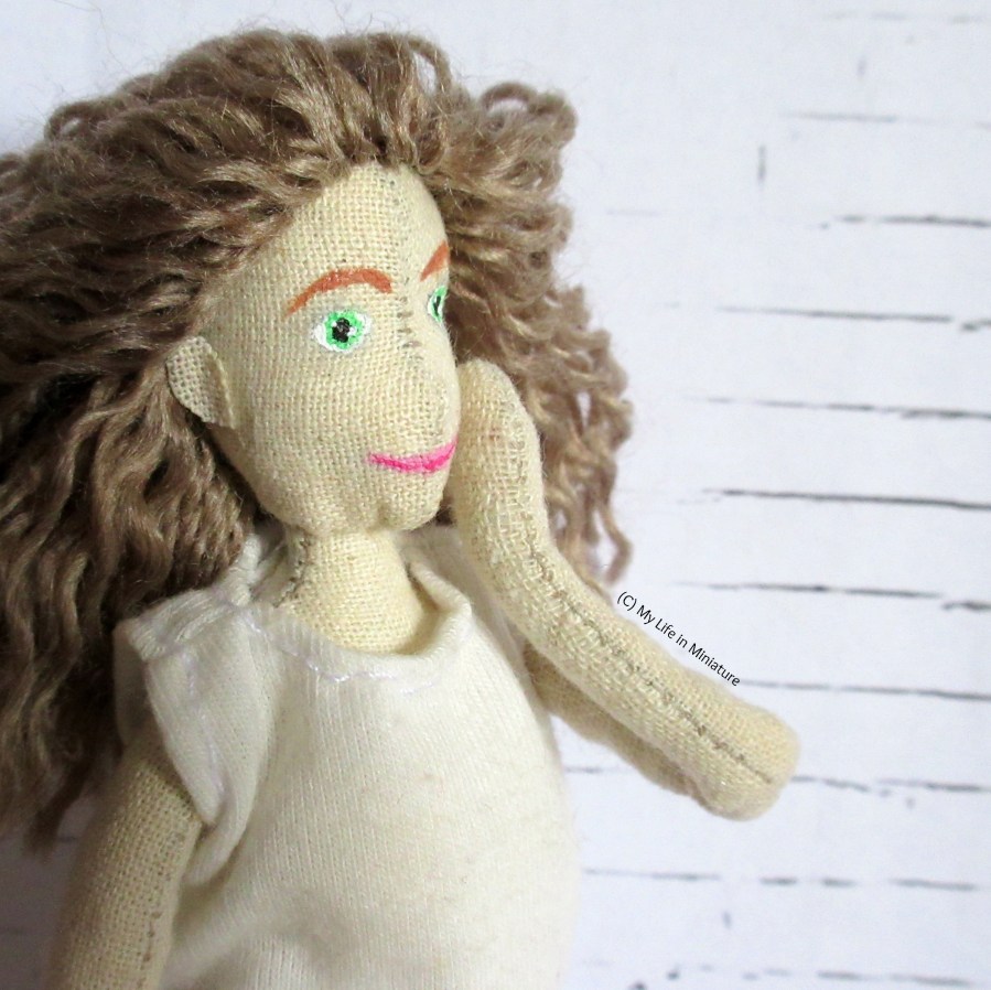 The muslin fabric doll has progressed to completion since last week, and as most of those progress pictures look like they’re from a horror movie, here she is with hair glued on….