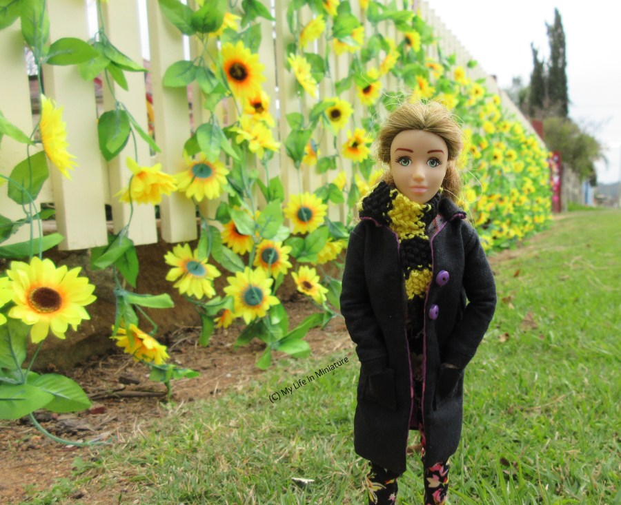 Sarah stands on grass near a cream-coloured fence, which has been covered with plastic sunflower vines. The fence extends into the background behind Sarah. She wears a knee-length black coat with a black-and-yellow striped scarf, and has her hands in her pockets, smiling at the camera.