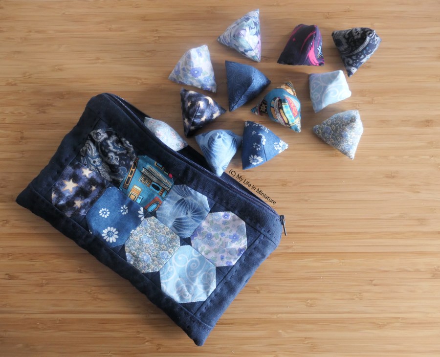 The pouch is also entirely made of stash fabric (are you proud?). The back and lining are both plain navy, so not too exciting. I like the texture of the hand-sewn running stitch around the central patchwork.