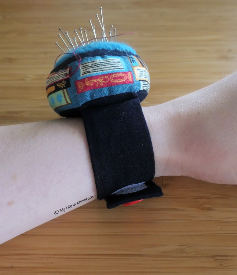 While I’ve got the sew-on Velcro out, let’s replace this piece of stick-on Velcro on my wrist pincushion that keeps peeling away.